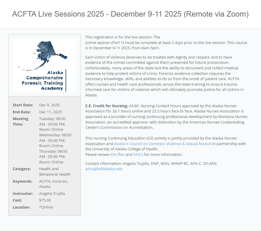 AaNA is an approved provider of continuing nursing education by Montana Nurses Association, an accredited approver by the American Nurses Credentialing Center’s Commission on Accreditation. AaNa and (APSC) Alaska Police Standards Council credits are offered with full participation.