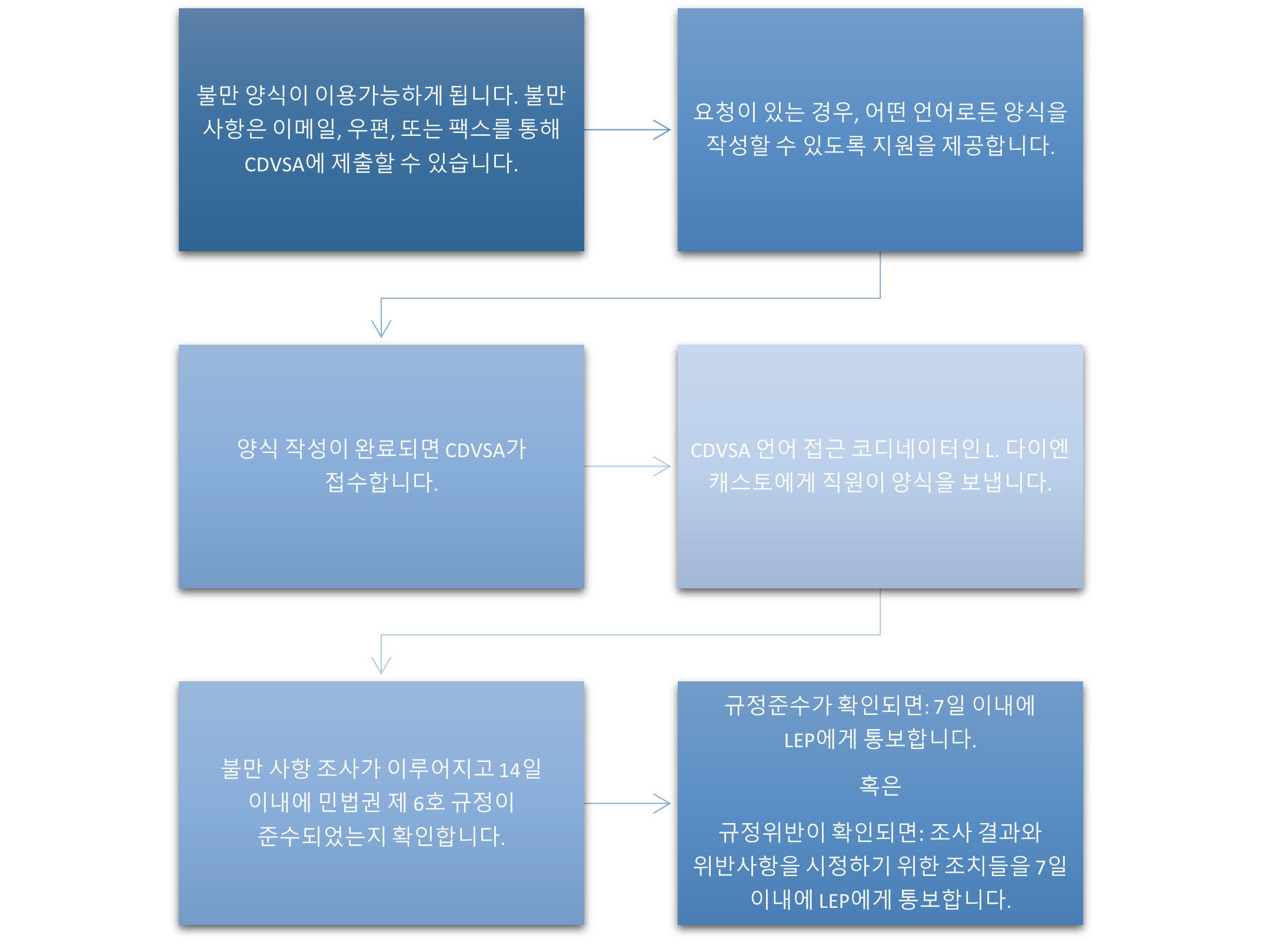 - 만약 개인이 LEP이고 양식을 작성하기 위해 언어 지원이 필요한 경우, CDVSA는 요청된 언어로 번역된 양식을 제공(존재하는 경우) 및 CDVSA의 언어 액세스 자원들을 통해 시각 번역* 기회를 제공할 수 있습니다.