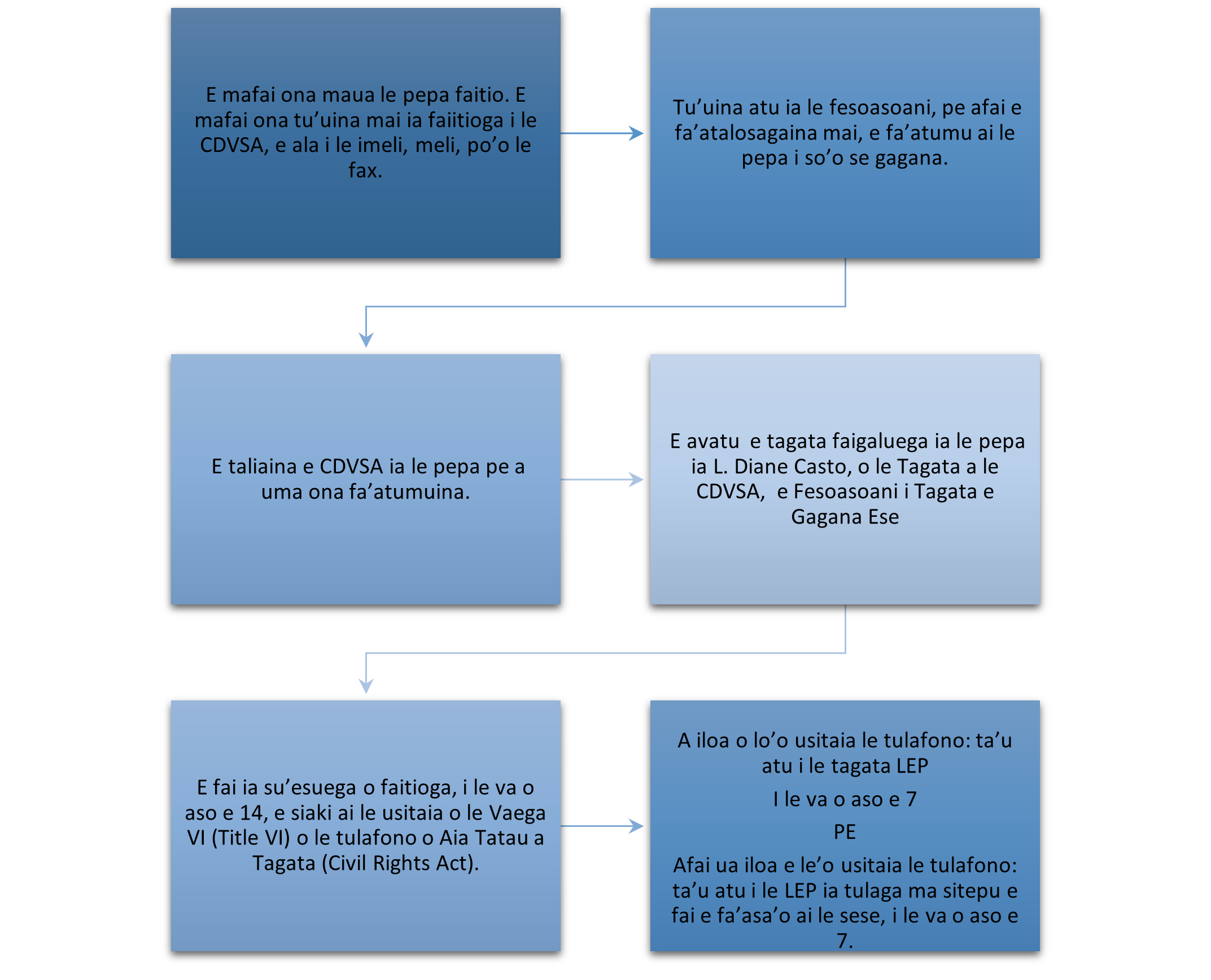 - O le a iloiloina e le Tagata Fa’amaopopo mea mo auaunaga i gagana ese a le CDVSA, ia so’o se faitioga latou te maua, e tu’uaia ai pe fa’ailoa mai ai le, ono lē usita’ia, o le tulafono o le Title VI o Aiā Tatau a Tagata.