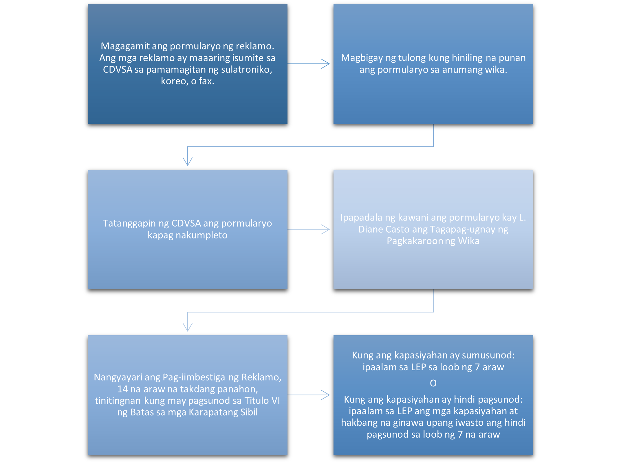 - Tatanggapin ng kawani ng CDVSA ang pormularyo kapag nakumpleto ng indibidwal at ipapadala sa Tagapag-ugnay ng Pagkakaroon ng Wika ng CDVSA para sa imbestigasyon sa reklamo.